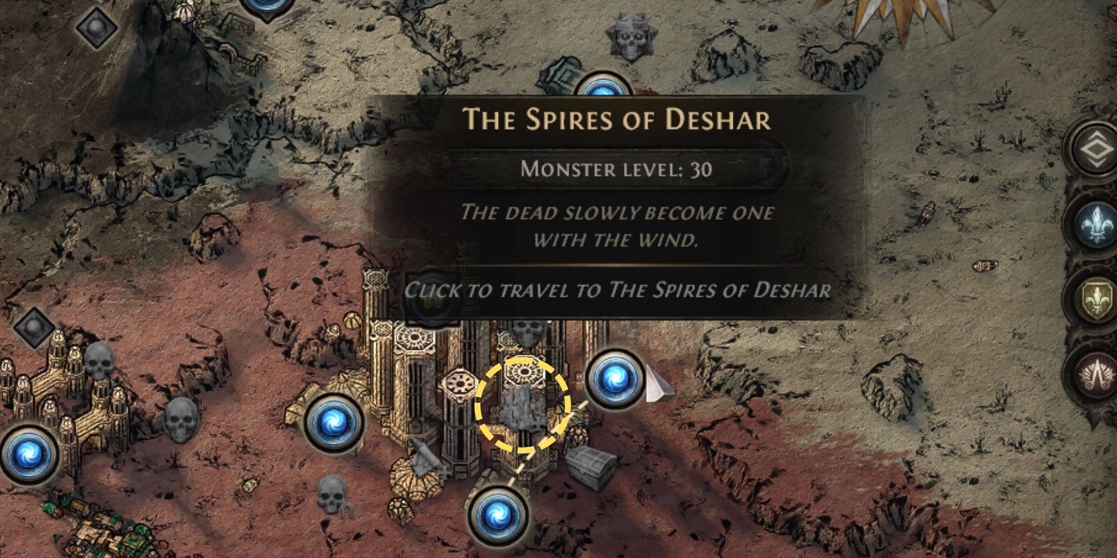 Como todo mapa em PoE 2 possui geração procedural, não existe uma rota fixa através das Torres de Deshar que garanta a descoberta. No entanto, o santuário aparece consistentemente em algum lugar dentro desta região do mapa — uma exploração minuciosa eventualmente revelará a estrutura de altar distintiva mostrada em nossa imagem de referência. Aproxime-se e interaja com o santuário para receber seu bônus de Resistência a Raios. Esteja preparado para combate imediato, pois os autômatos metálicos posicionados ao redor da arena são ativados simultaneamente ao santuário, iniciando hostilidades junto com todos os defensores mecânicos do mapa.